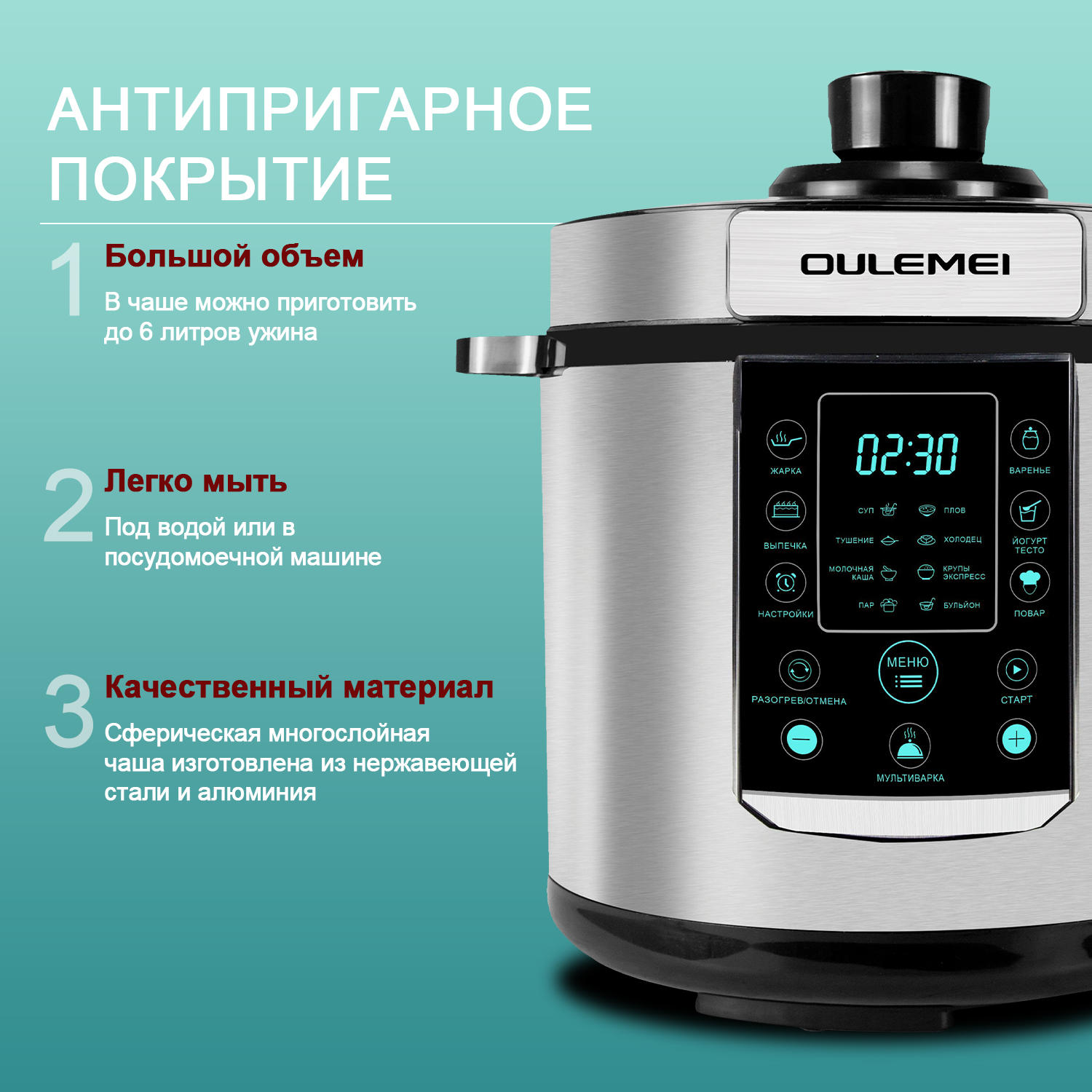 Функция Предварительная настройка времени приготовления, LED-дисплей, внутренняя кастрюля с антипригарным покрытием, защита от перегрева, устройство сброса давления, регулируемая настройка давления, защита от избыточного давления